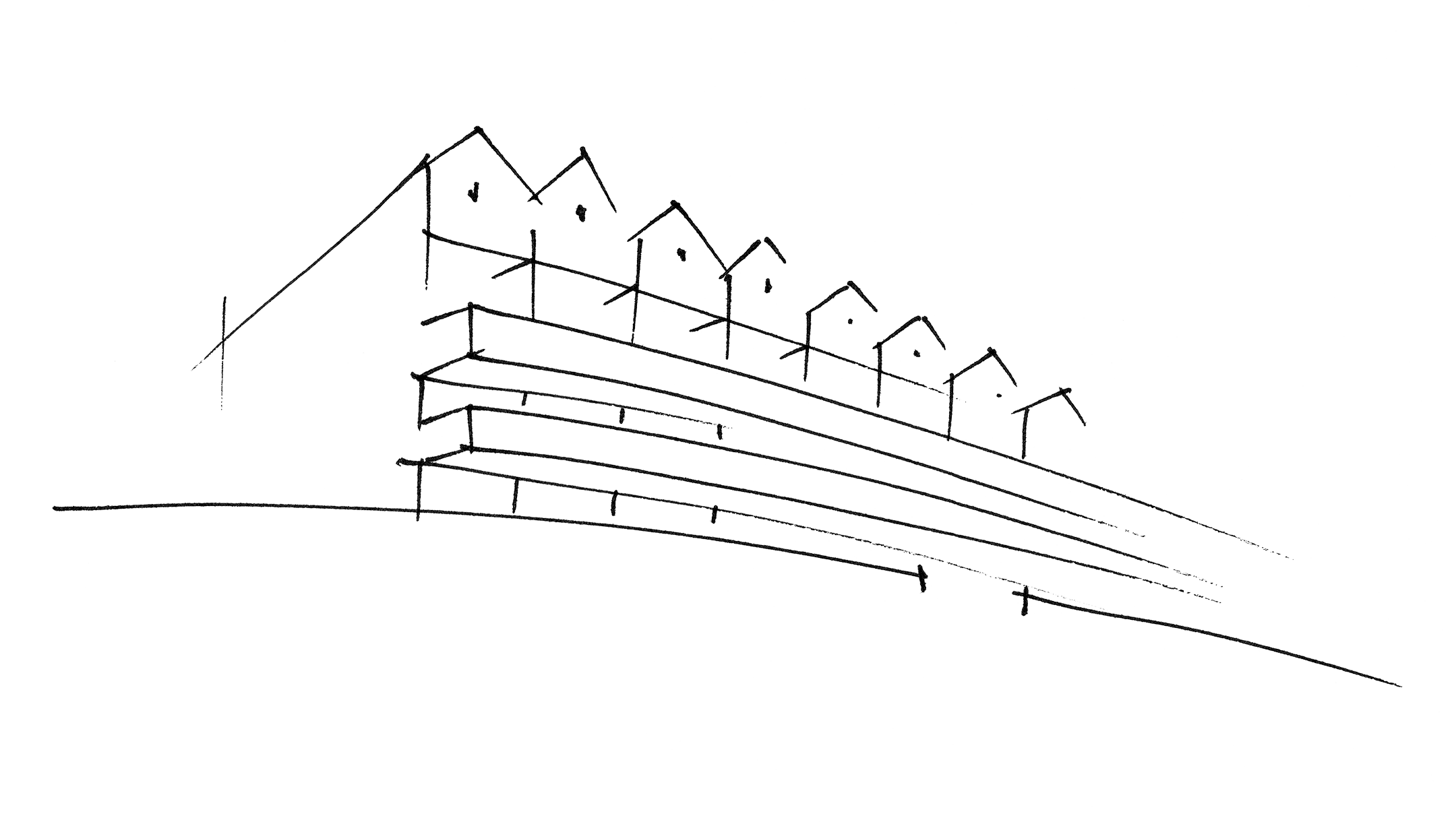 Dotar cada coluna de apartamentos da sua própria cobertura de duas águas permite que se faça esse aproveitamento das águas furtadas que abre porta à tipologia duplex no último piso.