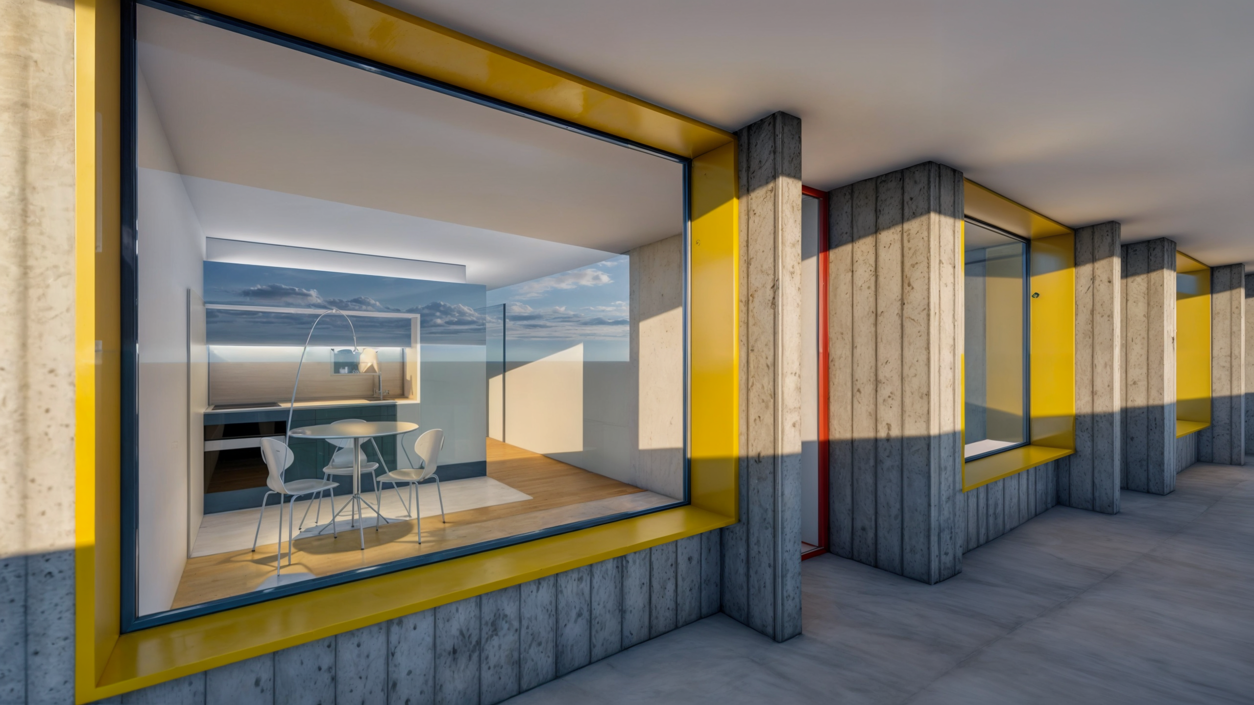 Esta imagem, estimulantemente diferente do prédio plurifamiliar convencional, não deixa de provocar uma sensação doméstica muito reconfortante, remetendo ao arquétipo quase infantil do que é uma casa, com duas águas e um vão central, constituindo, seguramente, mais um elemento diferenciador e valorizador no mercado habitacional.