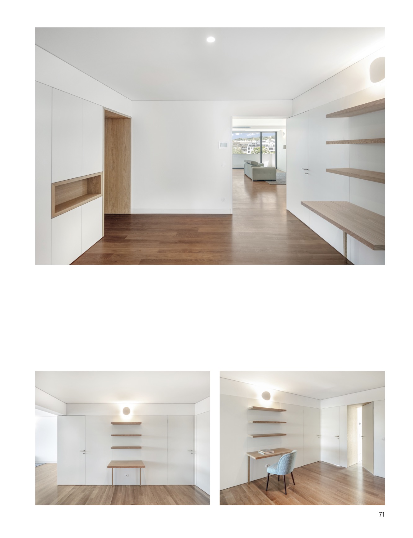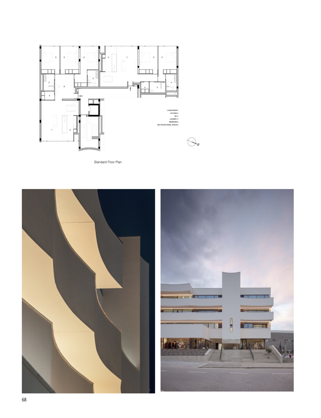 이 프로그램은 극도로 합리화된 디자인을 필요로 하지만, 주요 외관의 처리가 거리의 배경을 형성하는 빛과 그림자의 섬세한 놀이로 모놀리식 느낌을 깨고, 발코니의 추상적인 수평적 제스처를 동시에 방해하는 수직 패널을 제안한다. 이는 이 두 가지 형식적 장치 사이에 흥미로운 모순을 만들어내며, 이는 빛에 따라 변한다. 때로는 더 미묘하고 때로는 더 단호하다. 또한 통합된 도심의 조밀한 거리의 특징적인 수직적 리듬을 참조한다.