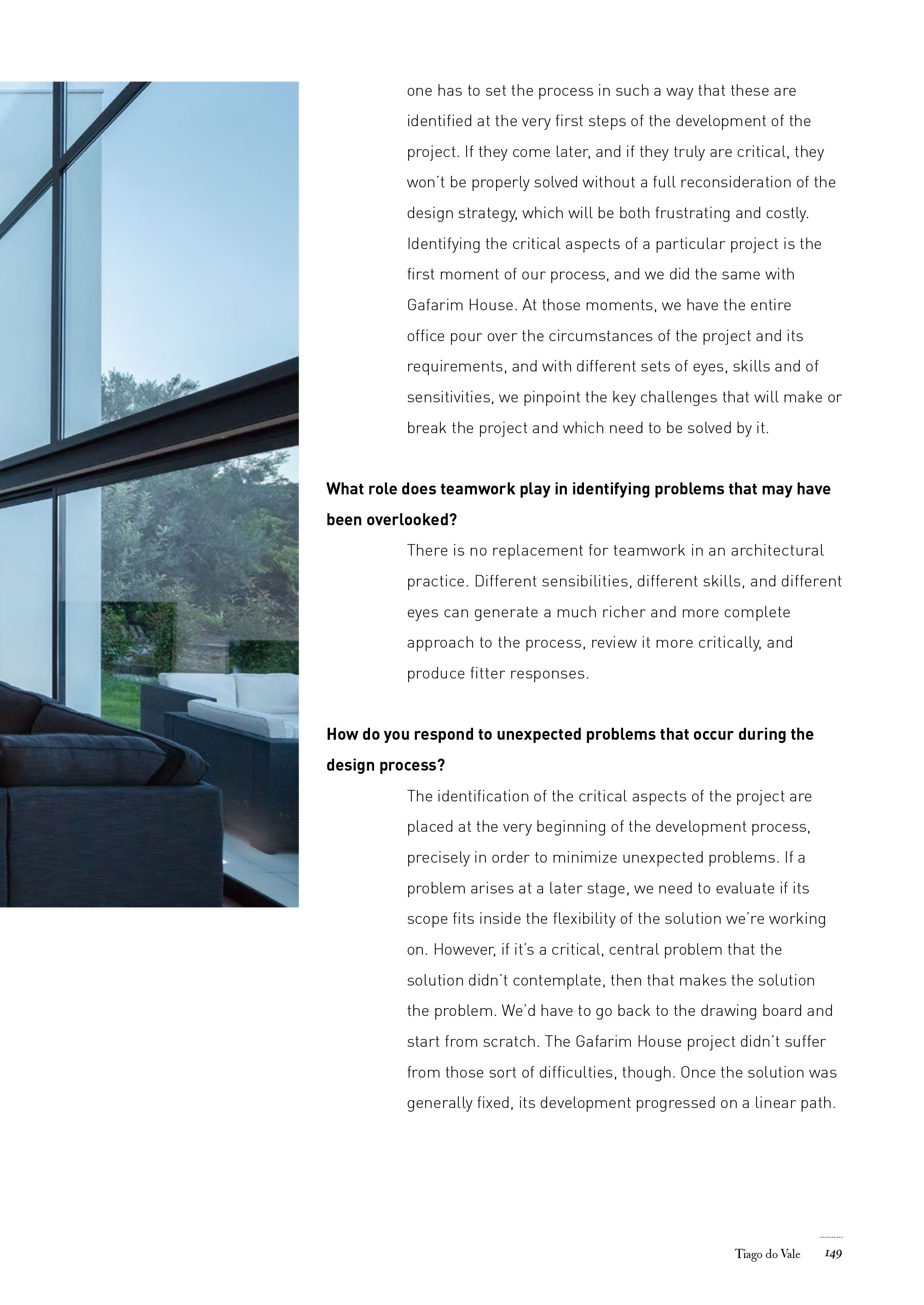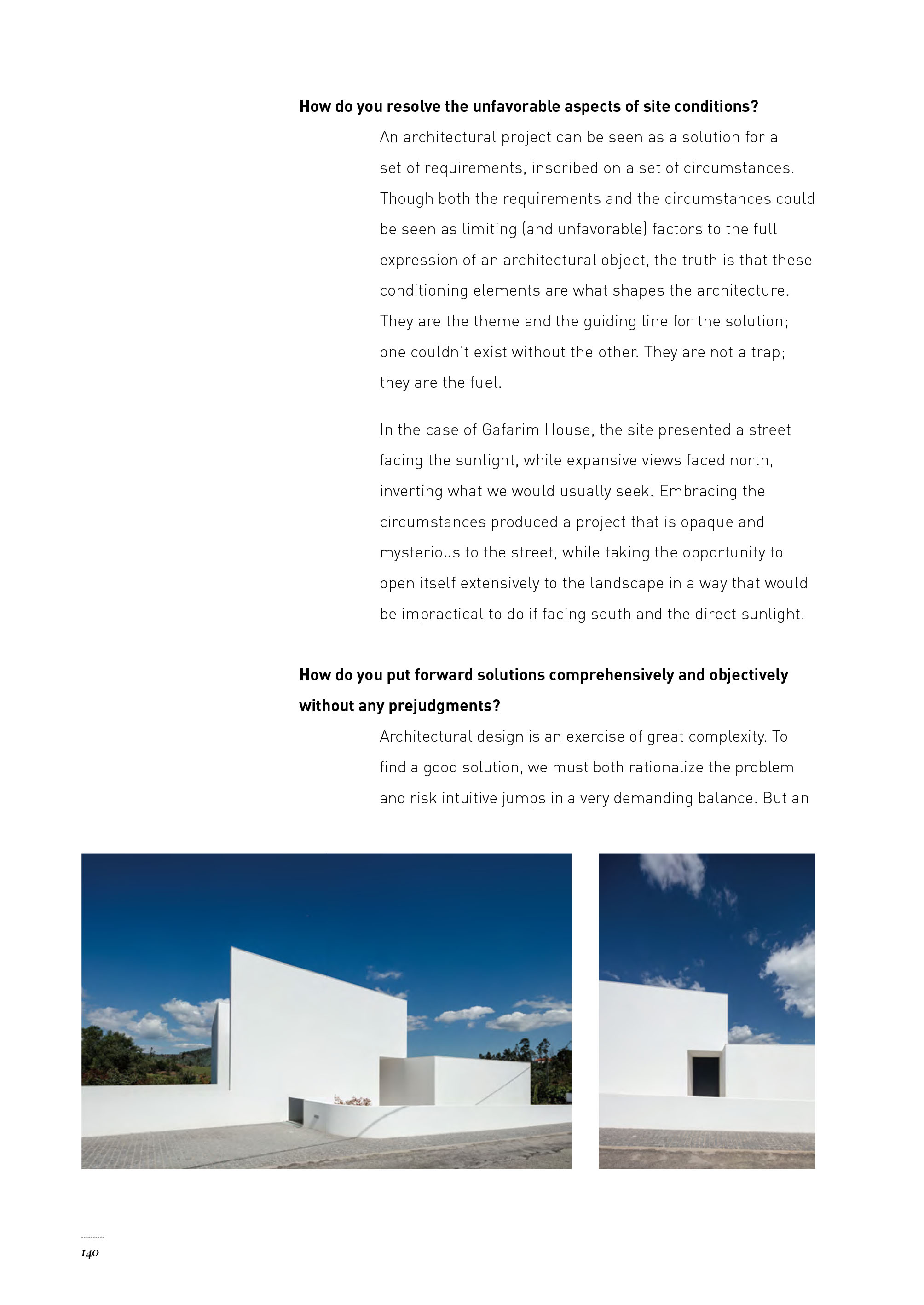 I find that, most of the time, the critical problems and their solutions are what will set the theme of the project. However, one has to set the process in such a way that these are identified at the very first steps of the development of the project. If they come later, and if they truly are critical, they won’t be properly solved without a full reconsideration of the design strategy, which will be both frustrating and costly. Identifying the critical aspects of a particular project is the first moment of our process, and we did the same with Gafarim House. At those moments, we have the entire office pour over the circumstances of the project and its requirements, and with different sets of eyes, skills and of sensitivities, we pinpoint the key challenges that will make or break the project and which need to be solved by it.