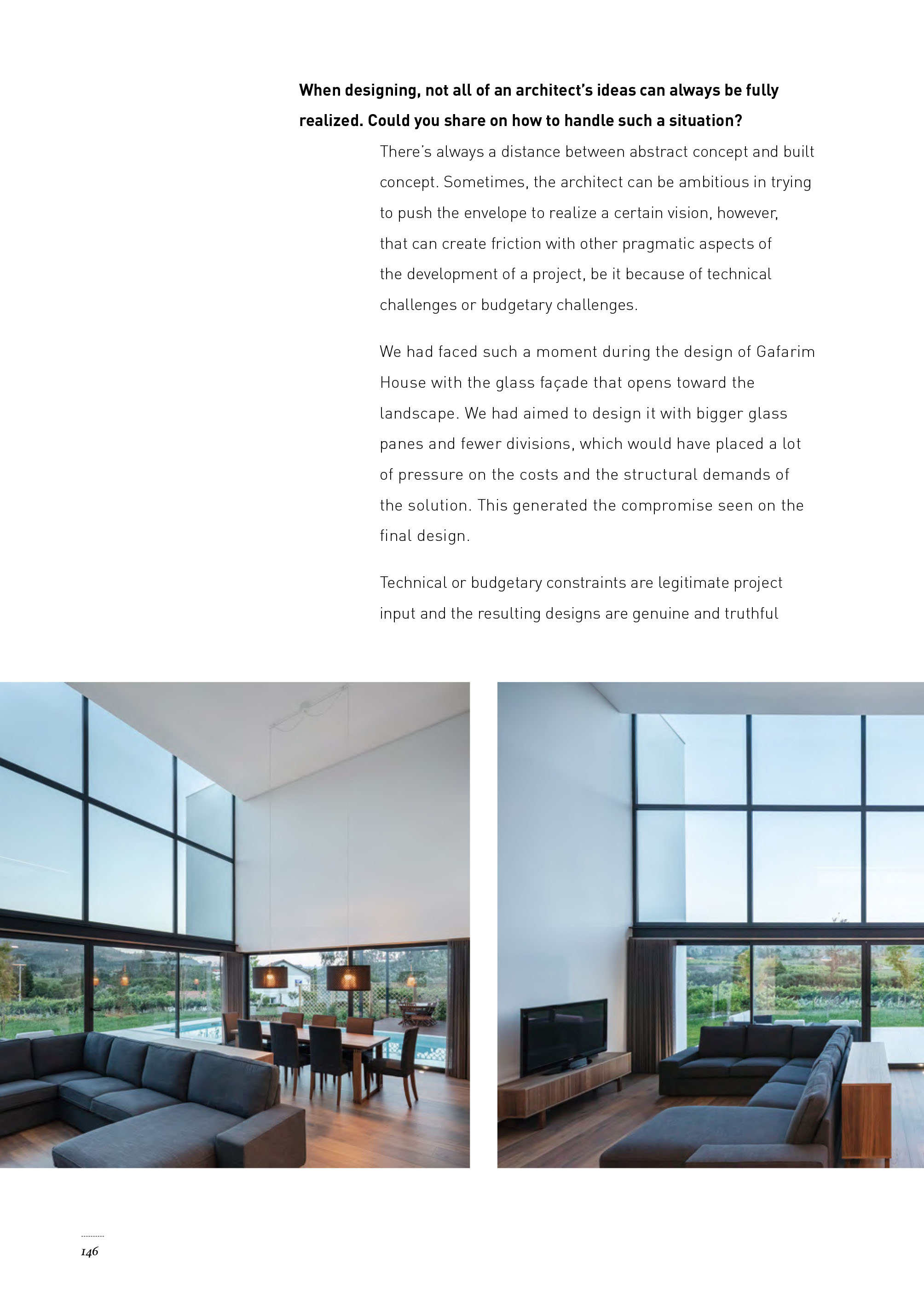 We had faced such a moment during the design of Gafarim House with the glass façade that opens toward the landscape. We had aimed to design it with bigger glass panes and fewer divisions, which would have placed a lot of pressure on the costs and the structural demands of the solution. This generated the compromise seen on the final design.