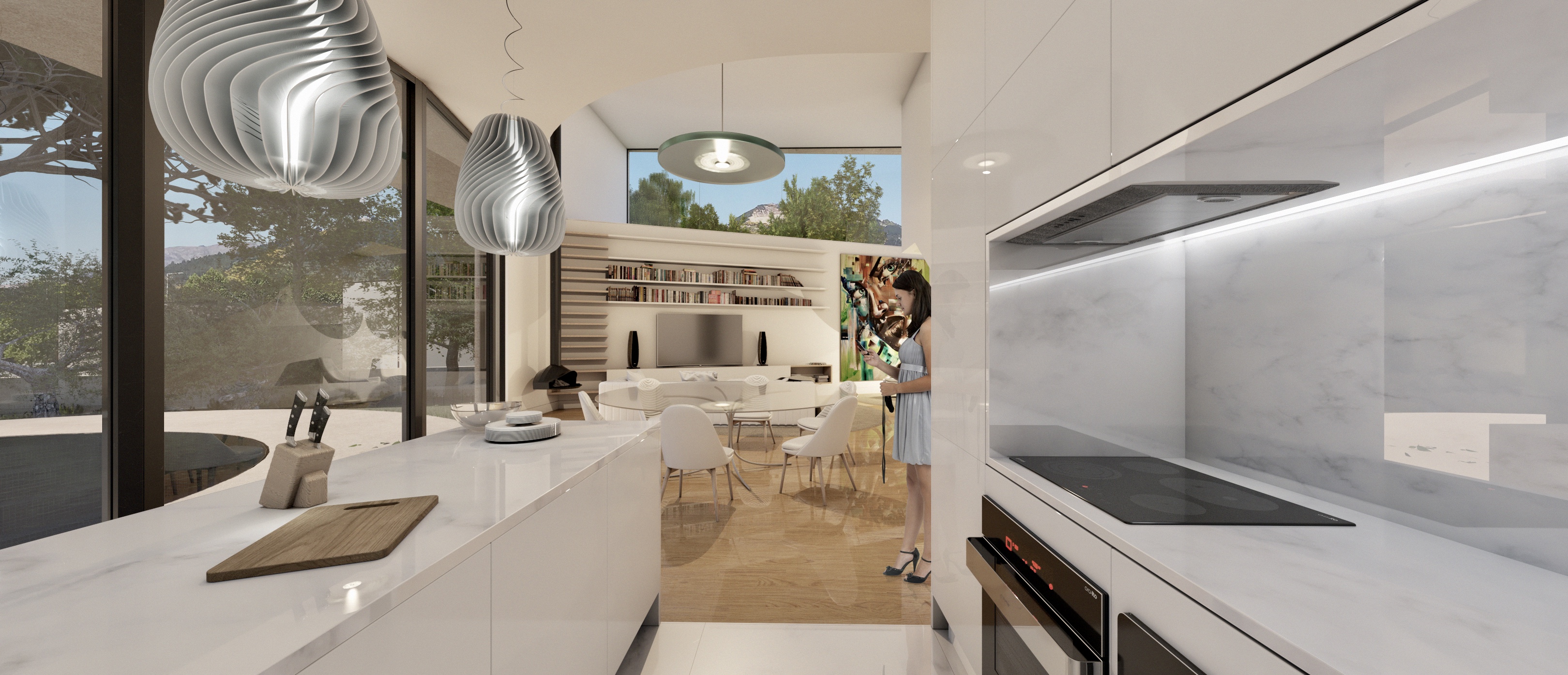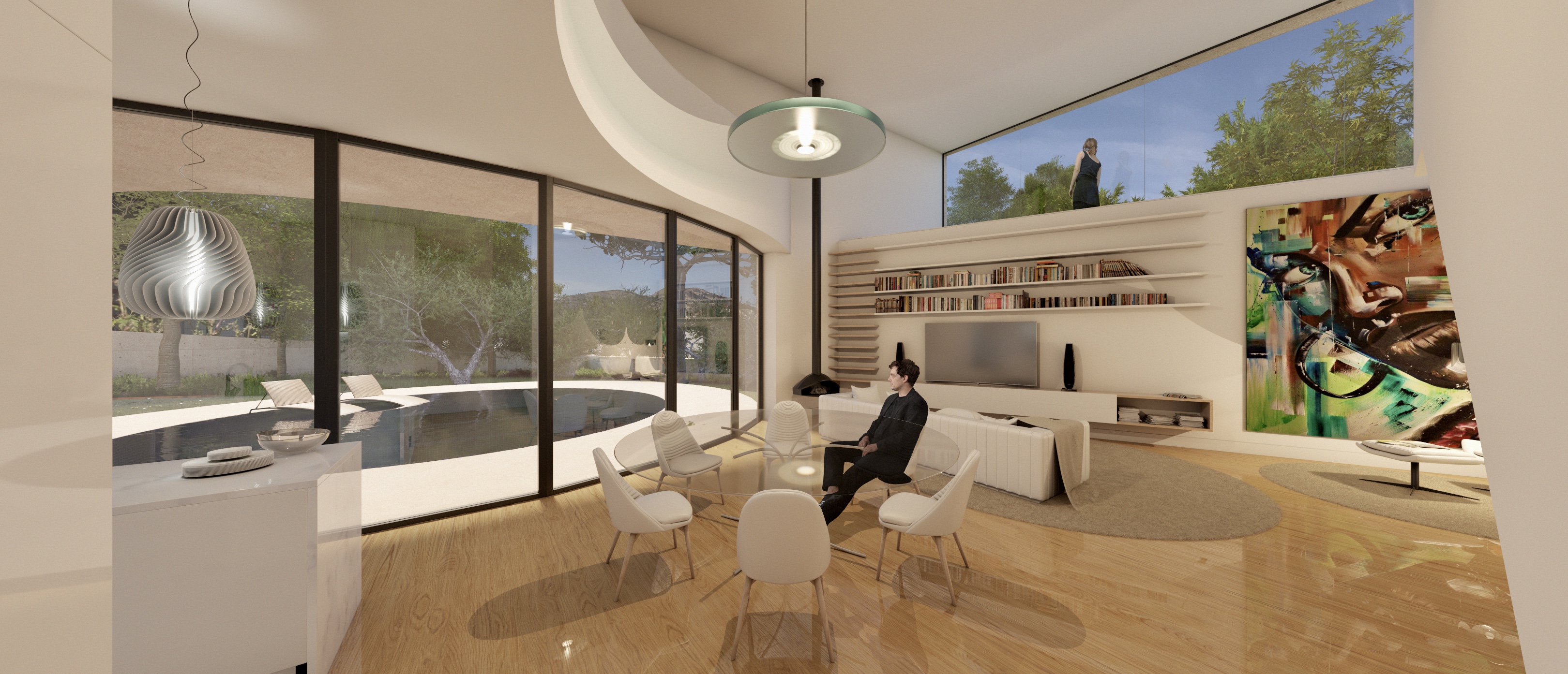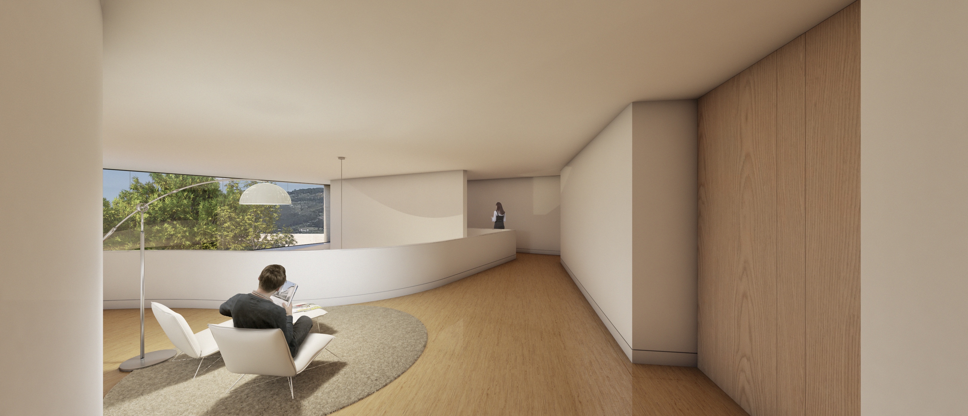 Assim, a solução desenha uma habitação que, no rés-do-chão, se relaciona com o jardim, voltando as costas à rua e encerrando-se em relação aos vizinho através de vegetação periférica e, no piso superior, procurando pontos de vista remotos, com os quartos a estabelecer uma relação visual com a mata a sul (desligando-se da rua abaixo através de um novo “muro” suspenso que controla os pontos de vista) e, a sul, sobre as construções, para o vale do Lima e o Paço de Calheiros, na margem oposta do rio.