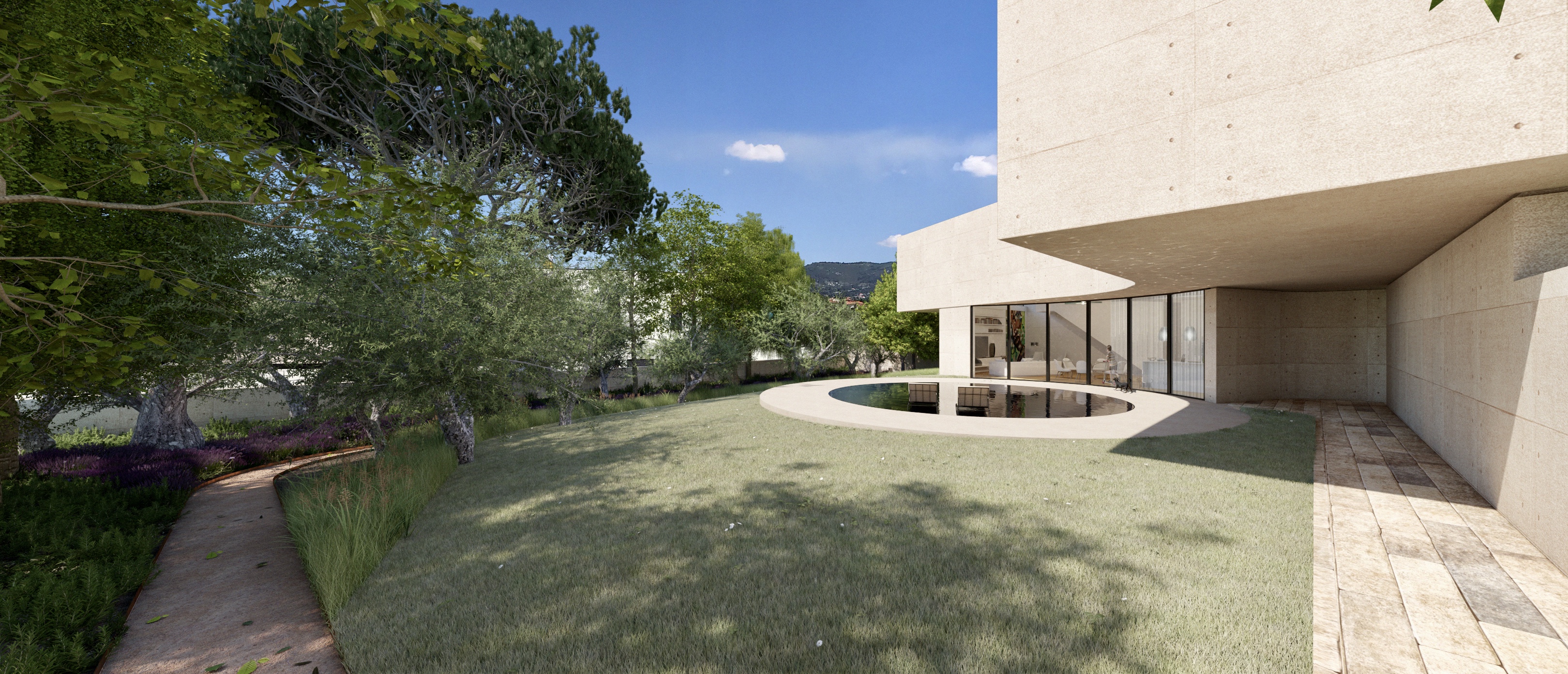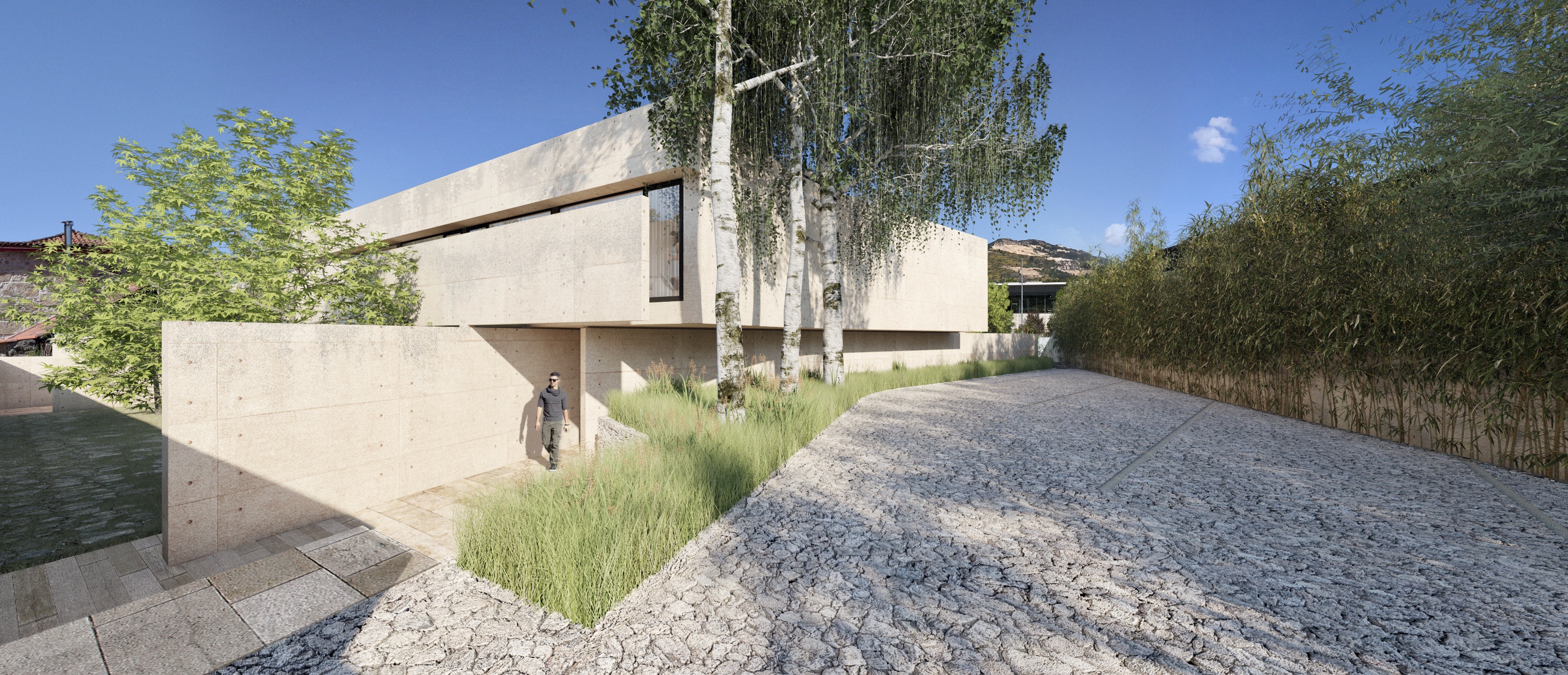 Neste contexto (de uma zona com identidade urbana prévia mas inserida num loteamento) pareceu central a preservação do forte muro granítico pré-existente. Ao mesmo tempo, era importante garantir a privacidade da casa em relação à rua e aos vizinhos.