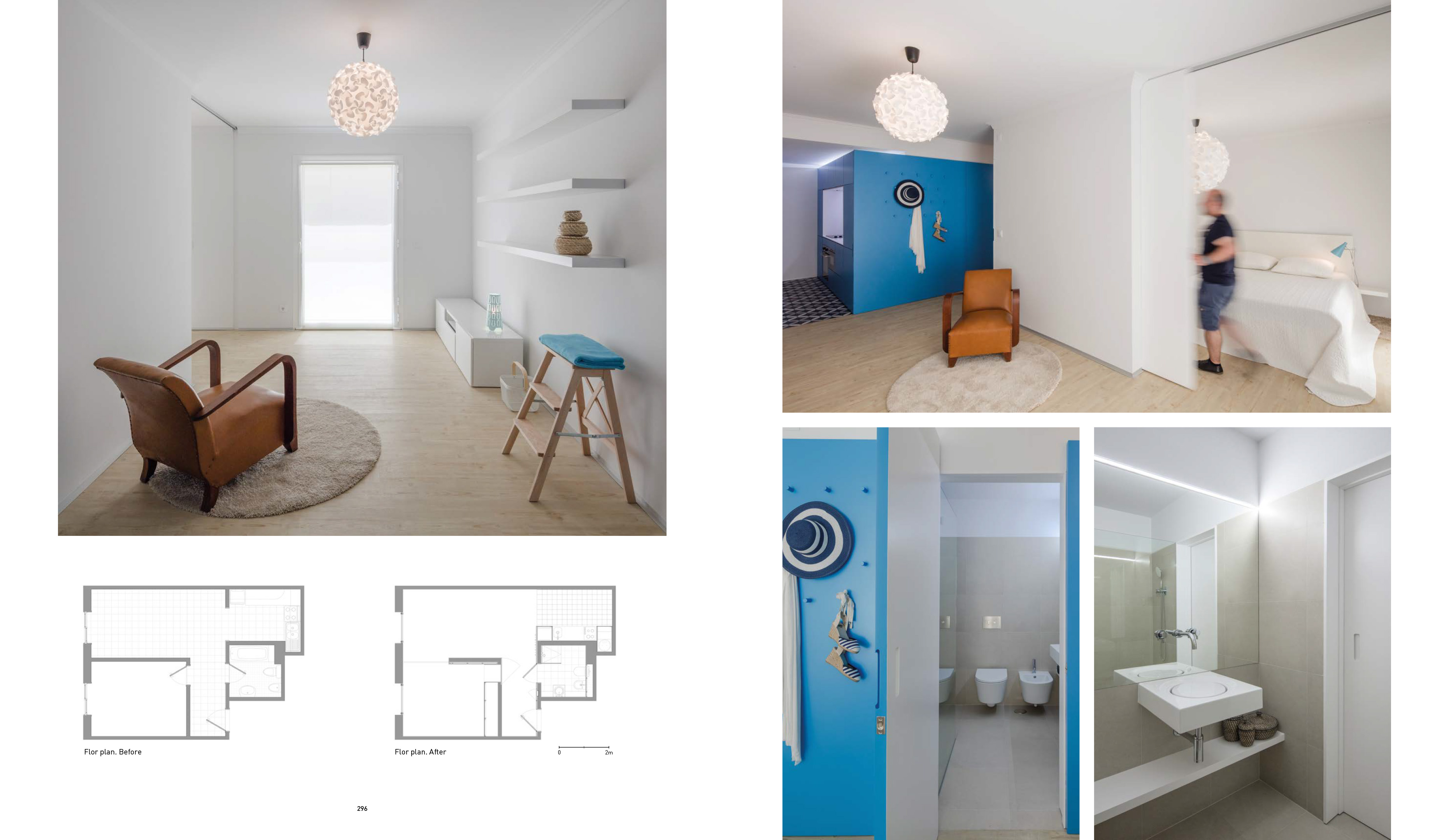 Construido en los años 80, este apartamento necesitaba urgentemente una reforma. Tanto sus infraestructuras como su organización estaban anticuadas, por lo que la intención era aprovechar al máximo sus potencialidades, a la vez que llevar su experiencia de vida a los estándares contemporáneos. El cliente necesitaba una actualización funcional y de infraestructuras, manteniendo la organización original (con un dormitorio independiente) y manteniendo los costes bajos. La estrategia del estudio consistió en potenciar la percepción de la luz y el espacio del apartamento utilizando tanto un enfoque muy minimalista como la repetición del color blanco. La pieza central de este proyecto, sin embargo, es un volumen azul que resuelve simultáneamente las puertas del apartamento y los armarios de la cocina, un gesto integral que aporta color pero sobre todo un tono lúdico y sin pretensiones a todo el apartamento. Este pequeño apartamento proporciona una experiencia relajante, llevando la playa al interior, y ahora es apto para 30 años más de uso sencillo y alegre.