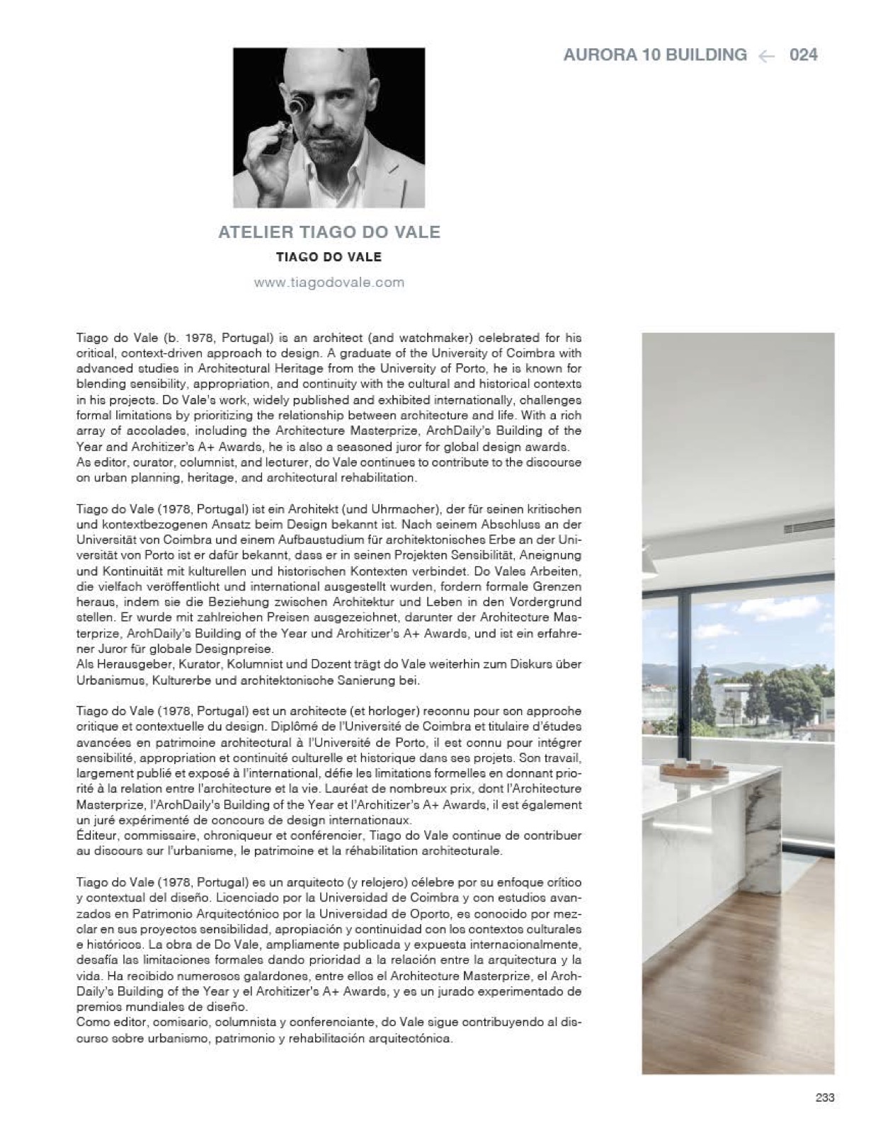 Tiago do Vale (1978, Portugal) ist ein Architekt (und Uhrmacher), der für seinen kritischen und kontextbezogenen Ansatz beim Design bekannt ist. Nach seinem Abschluss an der Universität von Coimbra und einem Aufbaustudium für architektonisches Erbe an der Universität von Porto ist er dafür bekannt, dass er in seinen Projekten Sensibilität, Aneignung und Kontinuität mit kulturellen und historischen Kontexten verbindet. Do Vales Arbeiten, die vielfach veröffentlicht und international ausgestellt wurden, fordern formale Grenzen heraus, indem sie die Beziehung zwischen Architektur und Leben in den Vordergrund stellen. Er wurde mit zahlreichen Preisen ausgezeichnet, darunter der Architeoture Masterprize, ArchDaily’s Building of the Year und Architizer’s A+ Awards, und ist ein erfahrener Juror für globale Designpreise.