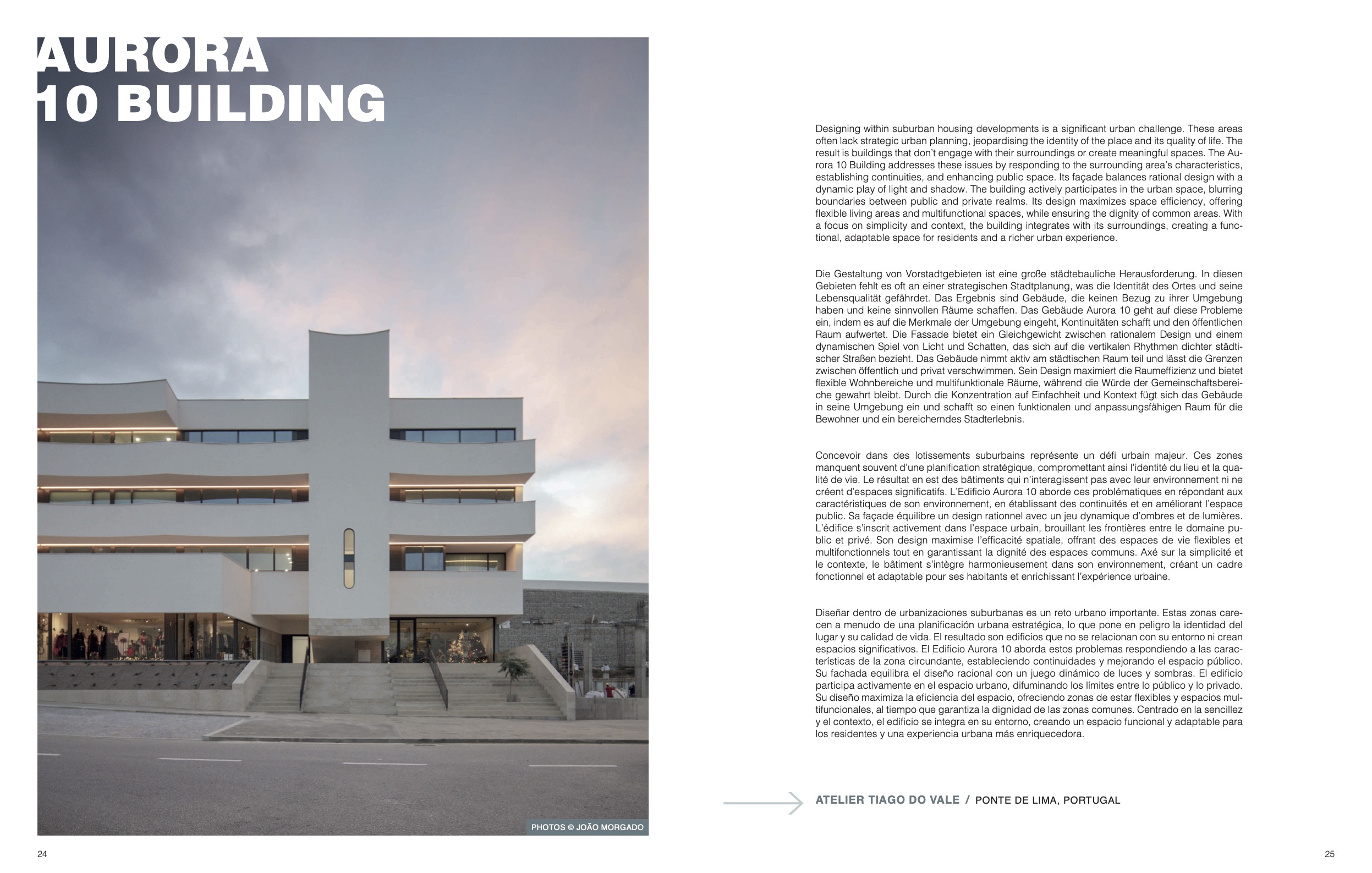 Diseñar dentro de urbanizaciones suburbanas es un reto urbano importante. Estas zonas carecen a menudo de una planificación urbana estratégica, lo que pone en peligro la identidad del lugar y su calidad de vida. El resultado son edificios que no se relacionan con su entorno ni crean espacios significativos. El Edificio Aurora 10 aborda estos problemas respondiendo a las características de la zona circundante, estableciendo continuidades y mejorando el espacio público. Su fachada equilibra el diseño racional con un juego dinámico de luces y sombras. El edificio participa activamente en el espacio urbano, difuminando los límites entre lo público y lo privado. Su diseño maximiza la eficiencia del espacio, ofreciendo zonas de estar flexibles y espacios multifuncionales, al tiempo que garantiza la dignidad de las zonas comunes. Centrado en la sencillez y el contexto, el edificio se integra en su entorno, creando un espacio funcional y adaptable para los residentes y una experiencia urbana más enriquecedora.