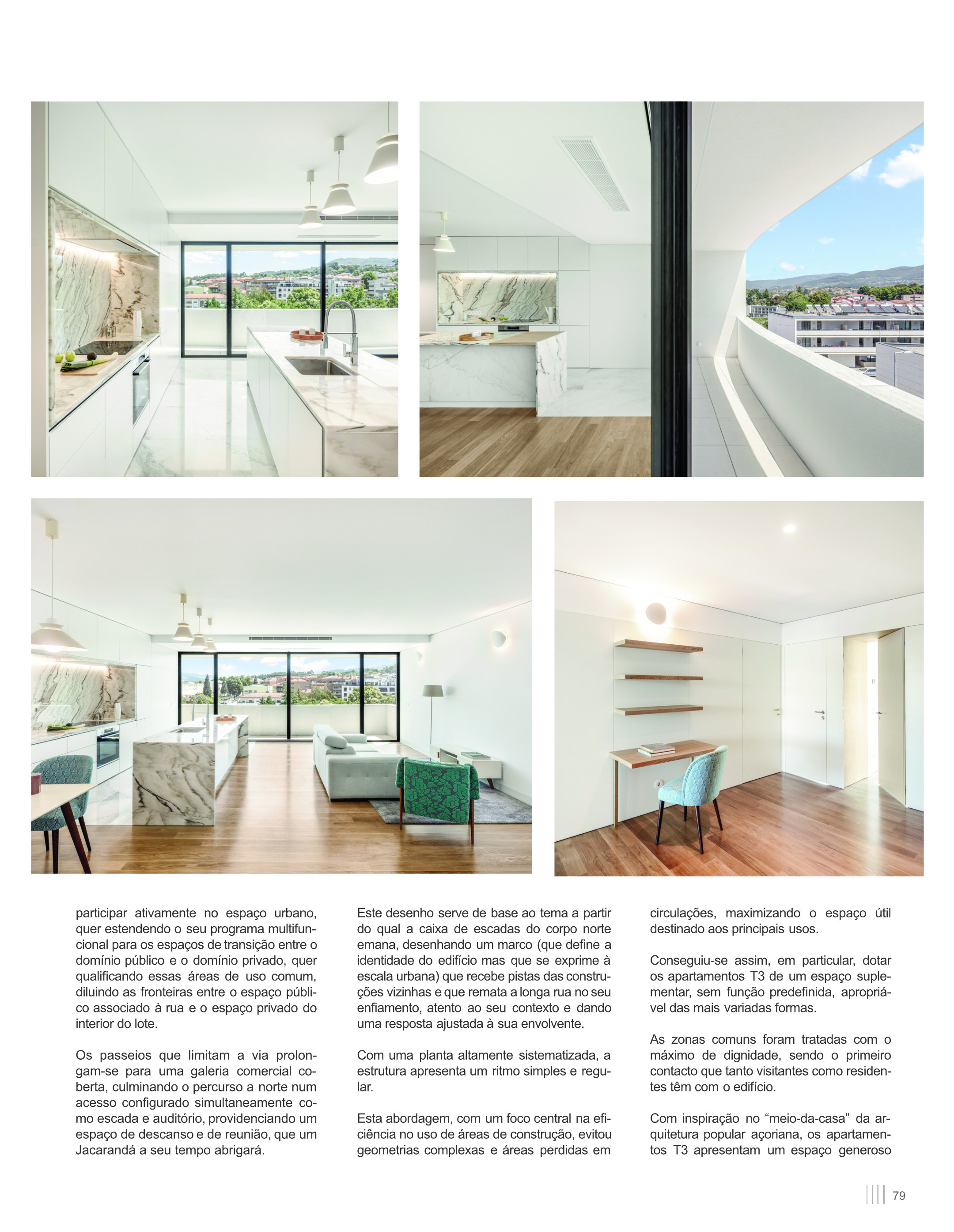 Com inspiração no “meio-da-casa” da arquitetura popular açoriana, os apartamentos T3 apresentam um espaço generoso relacionado com a entrada e as circulações interiores, sem função específica, que pode ser apropriado para os mais variados usos: espaço de estudo, oficina, biblioteca, escritório, ou até -recorrendo a compartimentação suplementar e separando o espaço de entrada da zona de distribuição para os quartos- arrumos, espaço para tratamento de roupas, despensa, closet, entre outros.