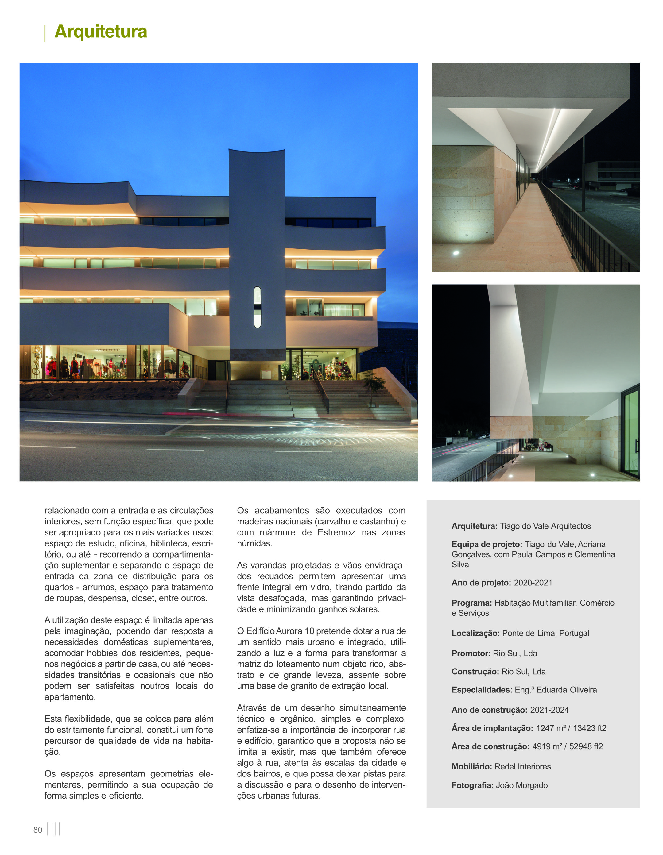 O Edifício Aurora 10 pretende dotar a rua de um sentido mais urbano e integrado, utilizando a luz e a forma para transformar a matriz do loteamento num objeto rico, abstrato e de grande leveza, assente sobre uma base de granito de extracção local.