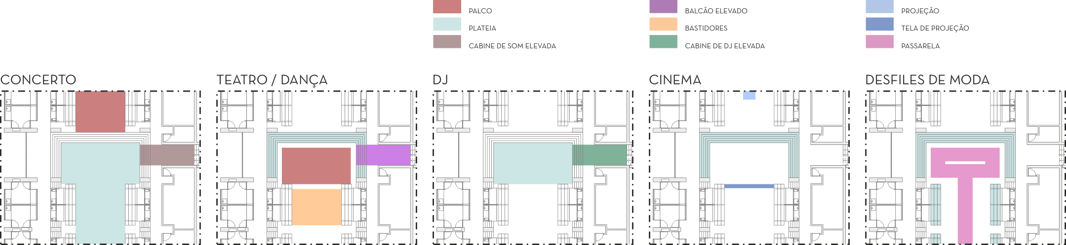 A “Praça” interior no cruzamento dos dois eixos de acesso pode funcionar como palco, sendo que os degraus que o envolvem em três dos seus lados podem ser utilizados como auditório. O balcão que marca as circulações verticais no piso superior pode, também, apresentar oportunidades diferentes para espetáculos de teatro, de música, recitação ou para oradores.