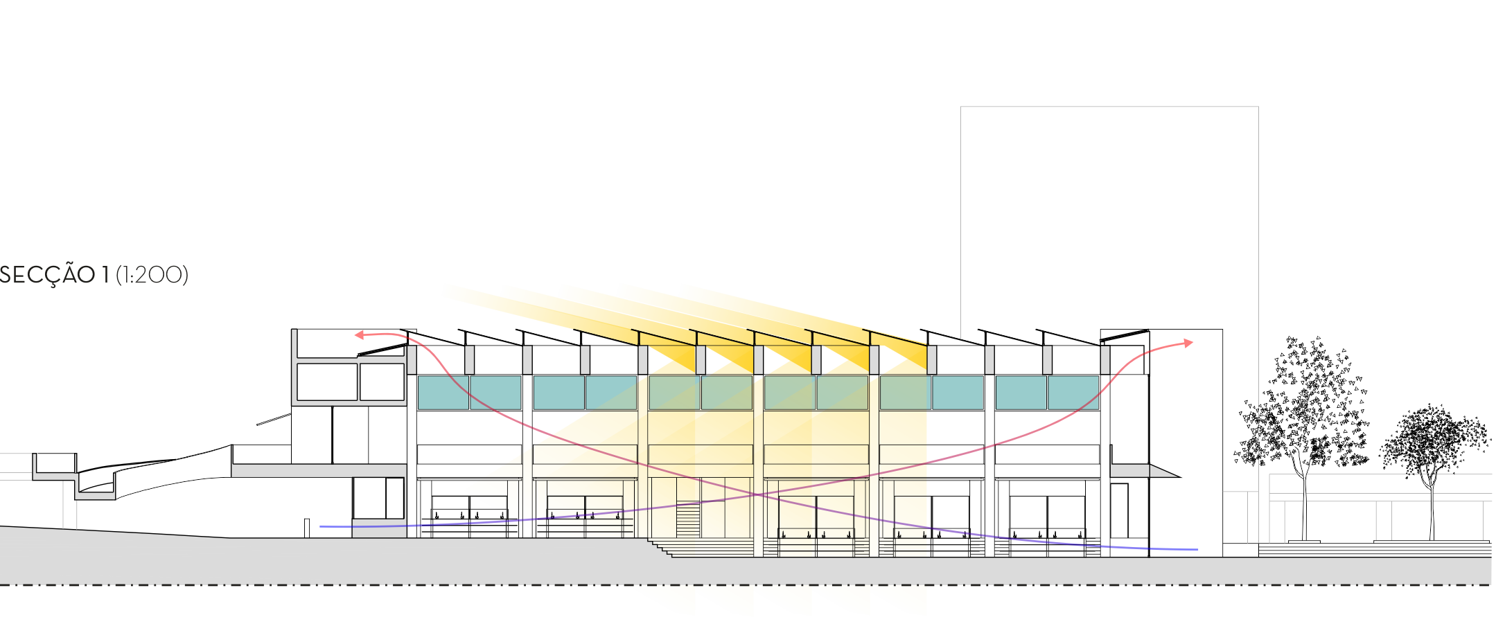 O pé-direito generoso proposto para a nave central permite um conforto térmico notável. No entanto, este pé-direito é complementando por uma circulação de ar passiva que tira partido dos ventos dominantes vindos do quadrante Norte para renovar e arrefecer o ar quando necessário.