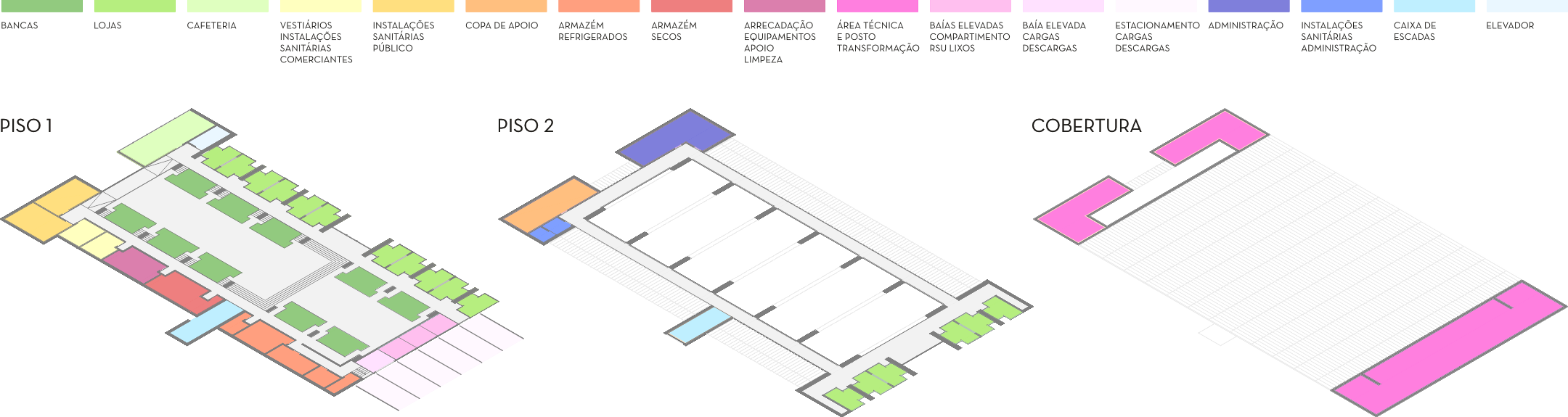 A solução desta proposta é tipologicamente elementar, genuína, parte da memória coletiva partilhada, e testada pelo tempo. Uma grande nave central organiza os espaços de bancas, com uma escala monumental que convida a entrada e a permanência no local, enquadrada por duas galerias laterais a uma cota superior, de escala mais humana, que servem as lojas e resolvem uma circulação periférica.