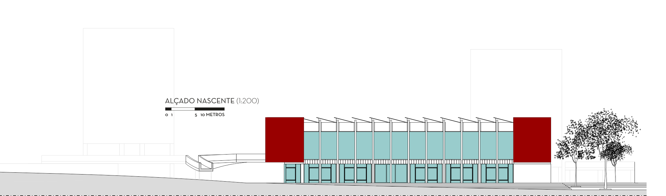 Desenham-se algumas lojas a essa cota, voltadas para a ponte pedonal, procurando transformá-la numa rua elevada e criando um polo de atração que mobilize essa circulação para o mercado.