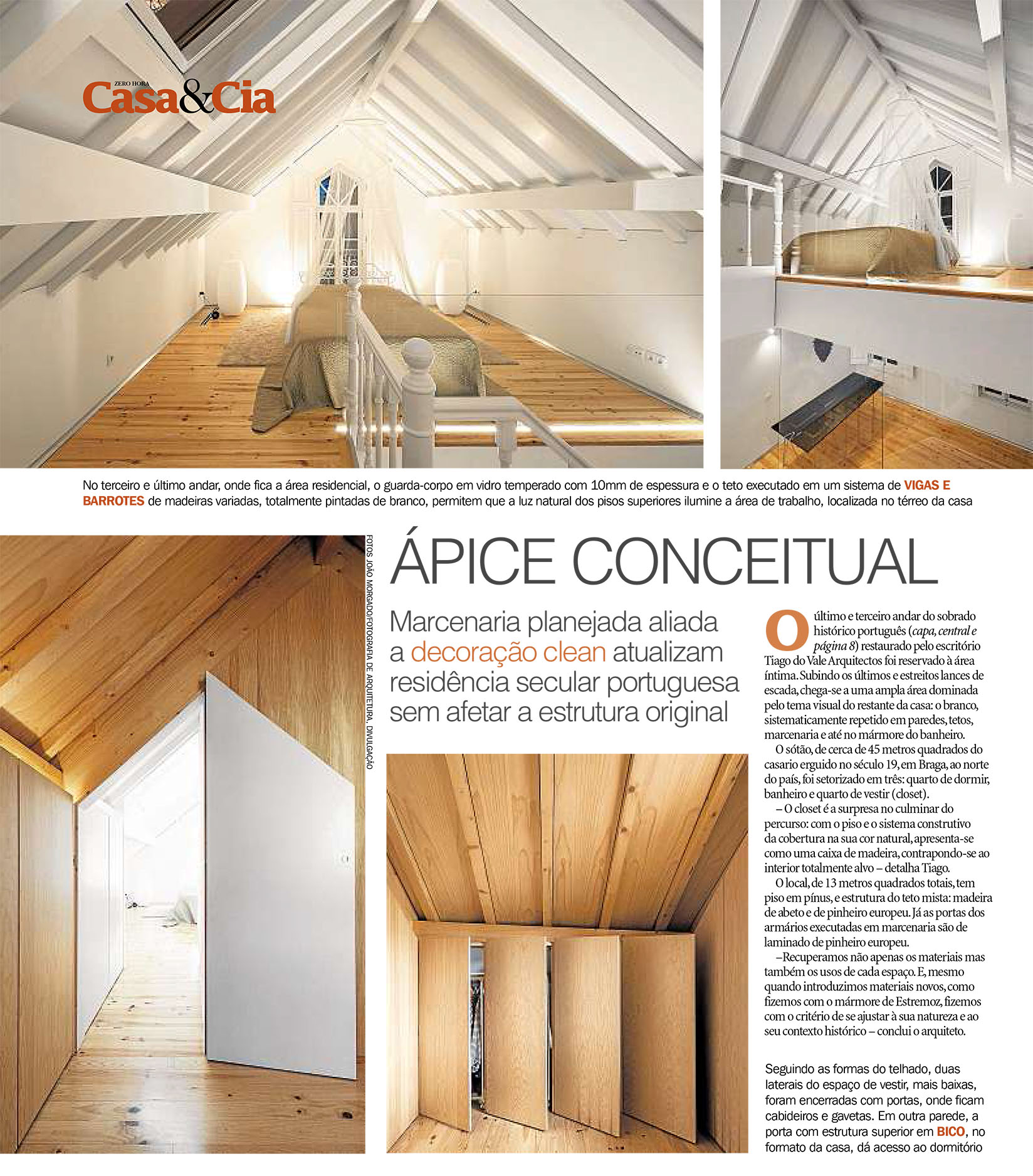 O sótão,de cerca de 45 metros quadrados do casario erguido no século 19, em Braga,ao norte do país, foi setorizado em três: quarto de dormir, banheiro e quarto de vestir (closet).