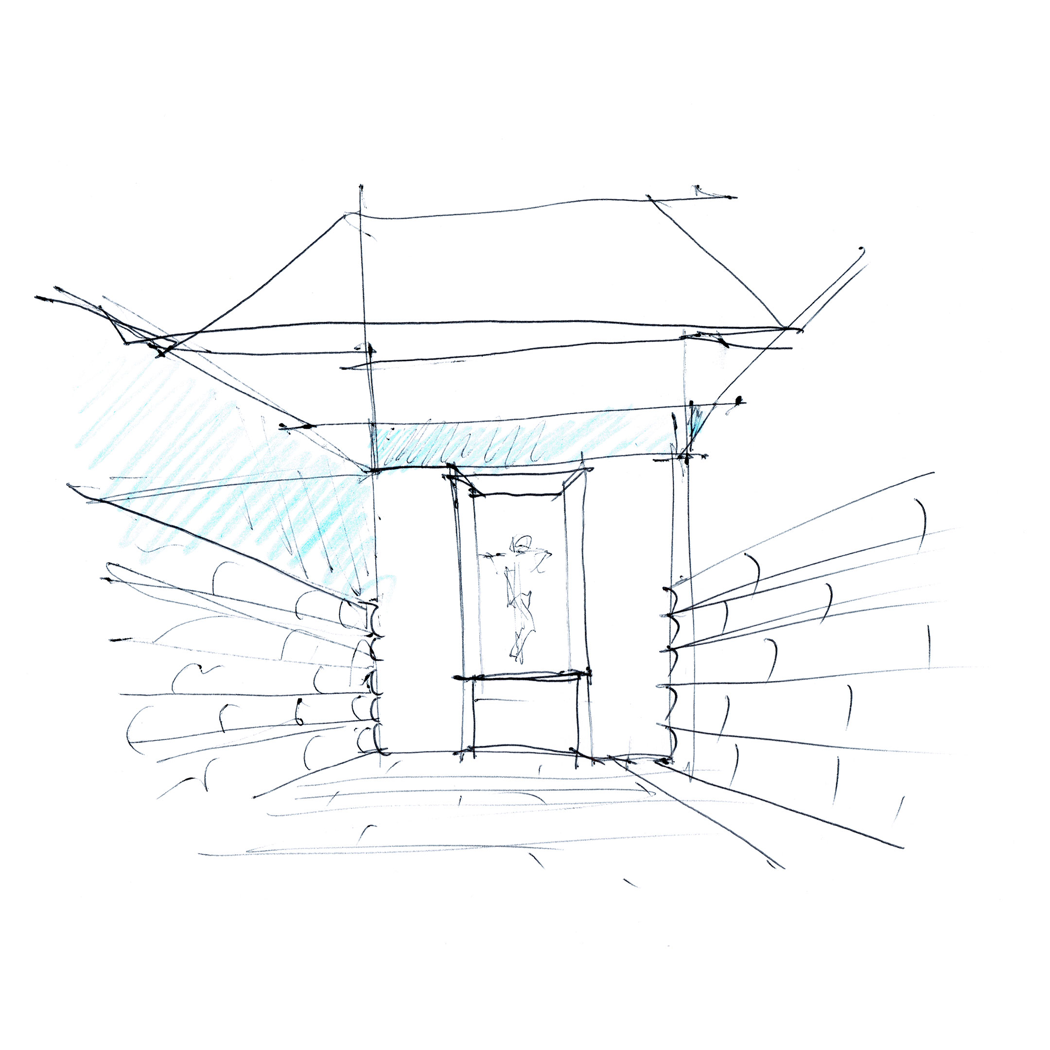 O desenho desta construção transforma o terreiro detrás do portão grande da Casa do Castelo num adro de apoio à capela, criando uma nova entrada formal para o conjunto, que serve e distribui três tipos de uso diferentes, para três destinos diferentes: hóspedes, visitantes-peregrinos e moradores.