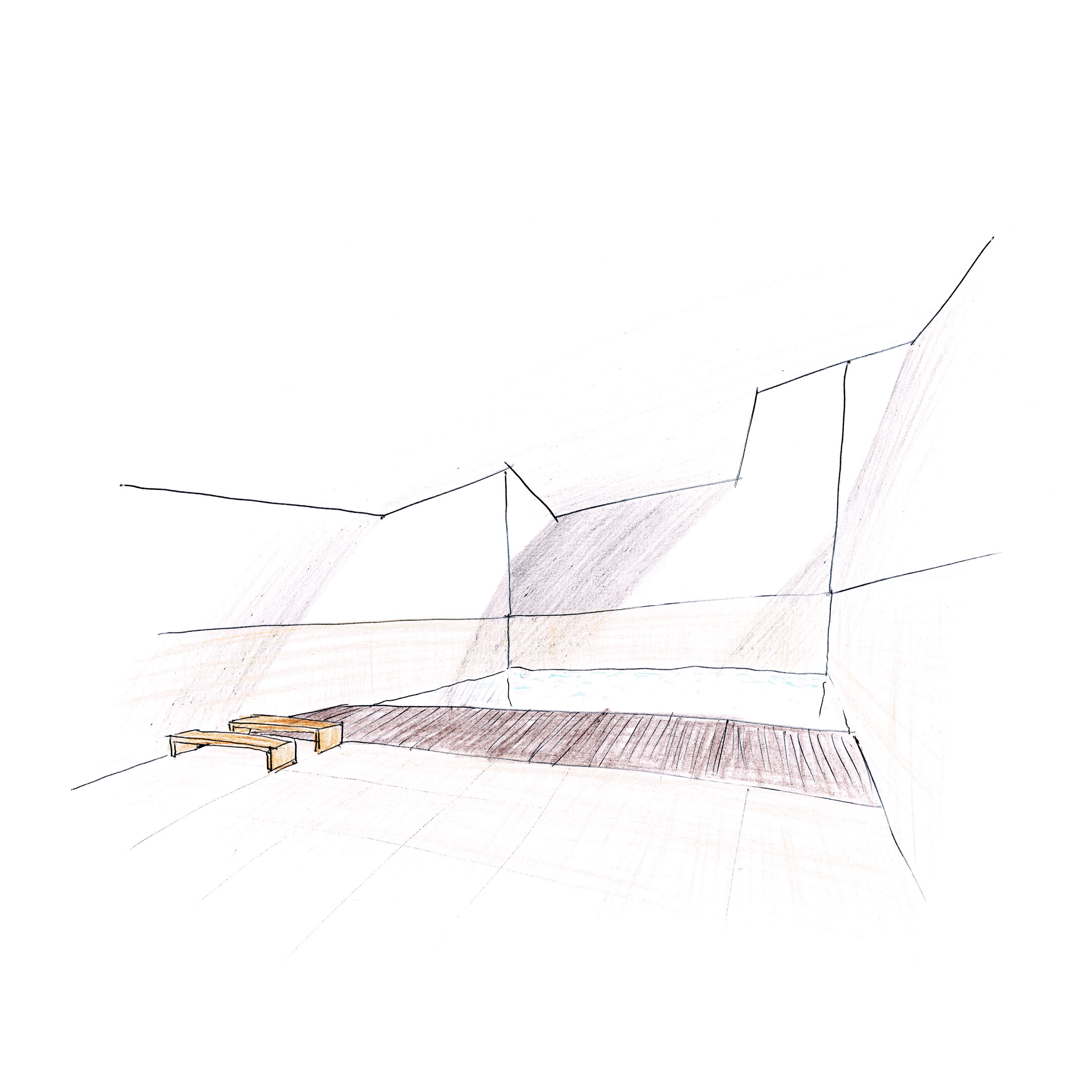 No piso térreo resolve-se todo o programa social, quer aquele que serve primariamente o programa de turismo (cozinha, sala de refeições, piscina interior) quer aquele que apoia e complementa o Caminho de Santiago e os seus peregrinos (sala de apoio ao peregrino, capela). No primeiro piso da construção proposta implantamos mais 4 suítes, para um total de 10.