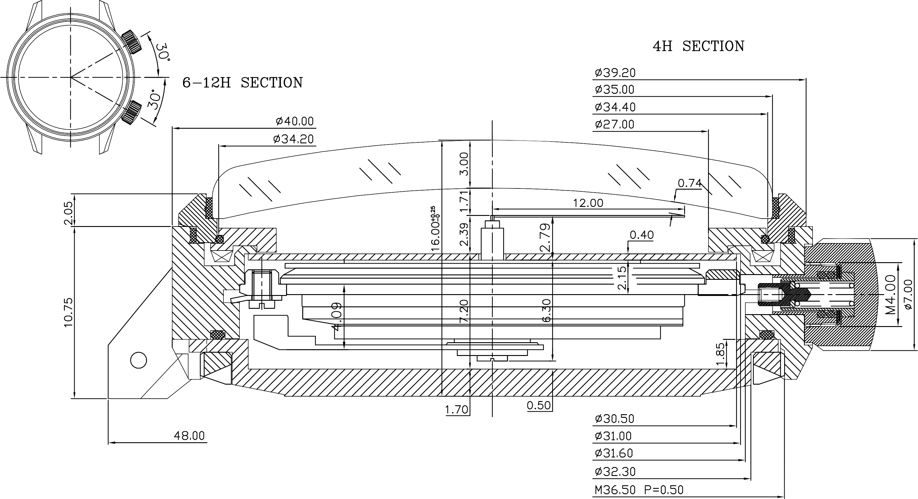 Approached in the 1960s by the Navy, Vostok developed an original solution for the water-resistance problem, proposing a dynamic architecture. With a floating case back held in place by an independent screw ring, the growing pressure increasingly compressed the case back against an oversized rubber seal while, simultaneously, the polycarbonate crystal deformed in a programmed way, pushing strongly against the case.