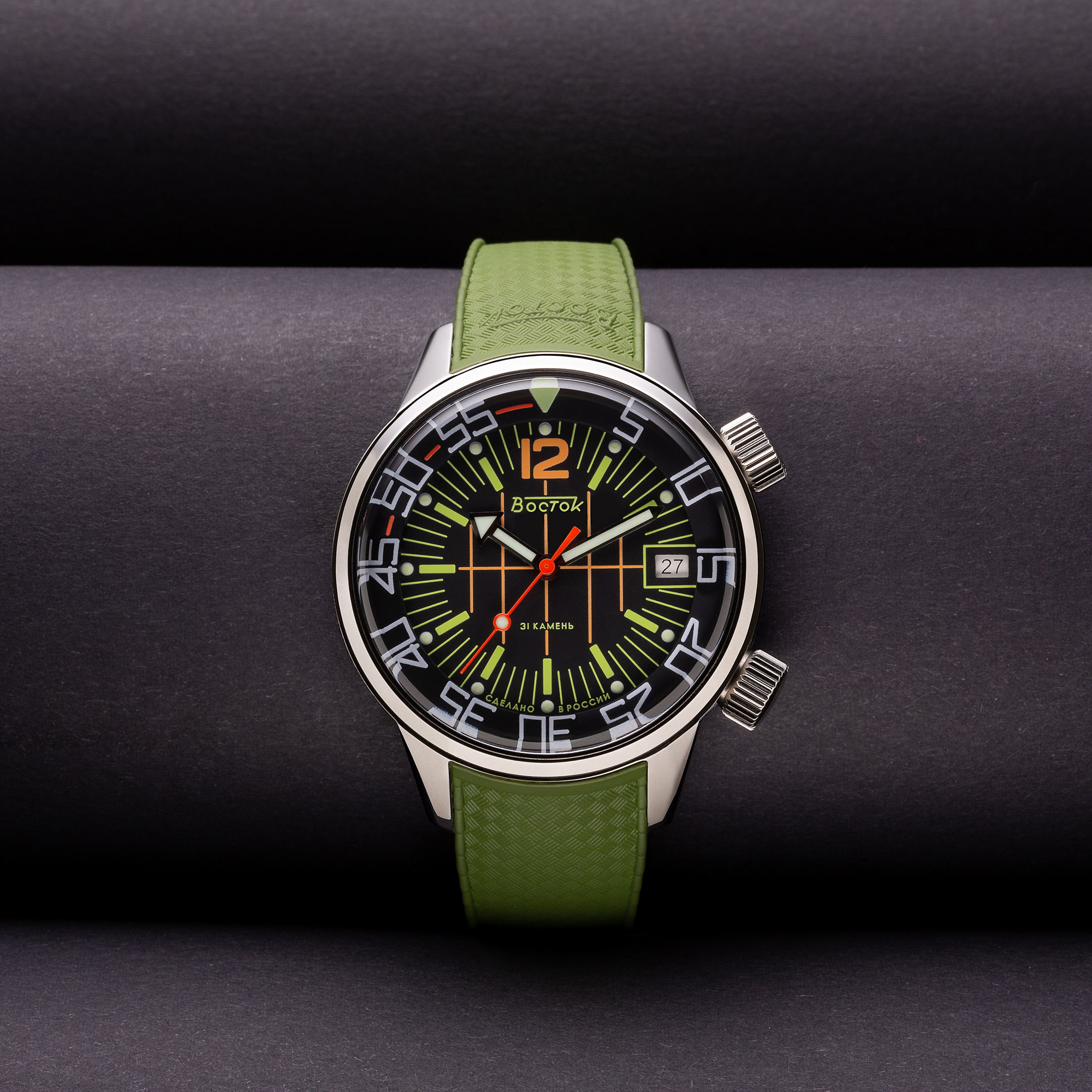 Vostok, through a special project coordinated by John Sullivan, managed by Dmitry Buyalov and designed by Tiago do Vale, reissued the Compressor in a very limited edition of 97 watches (59 with orange details, 39 with green details) and four pre-production prototypes, inspired by the original model but taking advantage of the best materials, tolerances and techniques allowed by today’s production standards.